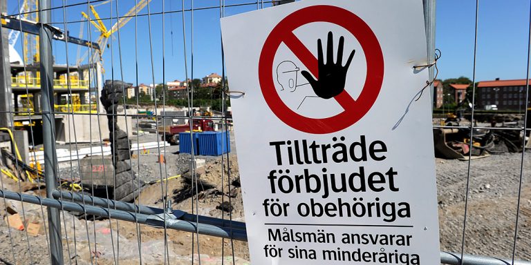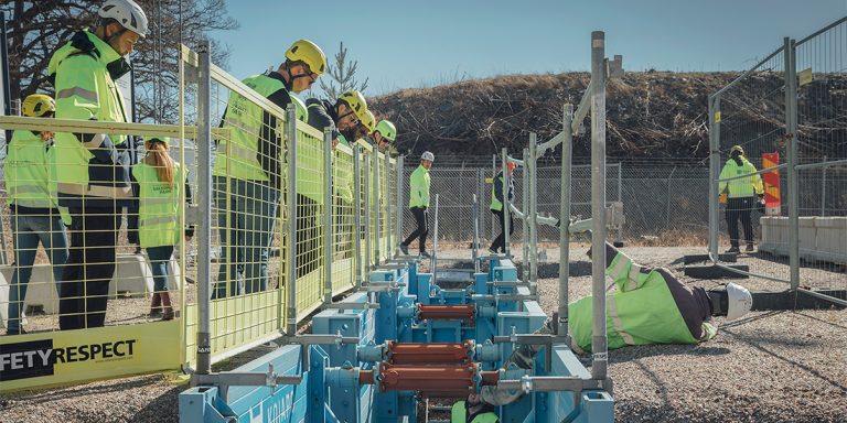 Den felmonterade byggställningen är en säkerhetsrisk och måste spärras av. Men den här gången är det ingen fara utan en övning på Byggbranschens säkerhetspark som vill lyfta kunskapen om arbetsmiljö på ett annorlunda sätt.